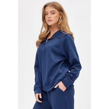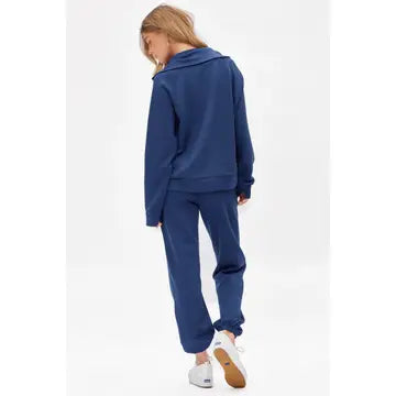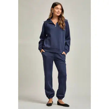 This ultra-soft half-zip pullover paired with matching joggers is designed for effortless comfort and everyday style. The relaxed fit, cozy funnel neckline, and stretchy jogger bottoms make it perfect for running errands, traveling, or cuddling up at home. Finished in a rich deep-blue hue this set keeps you comfortable no matter what your day looks like.